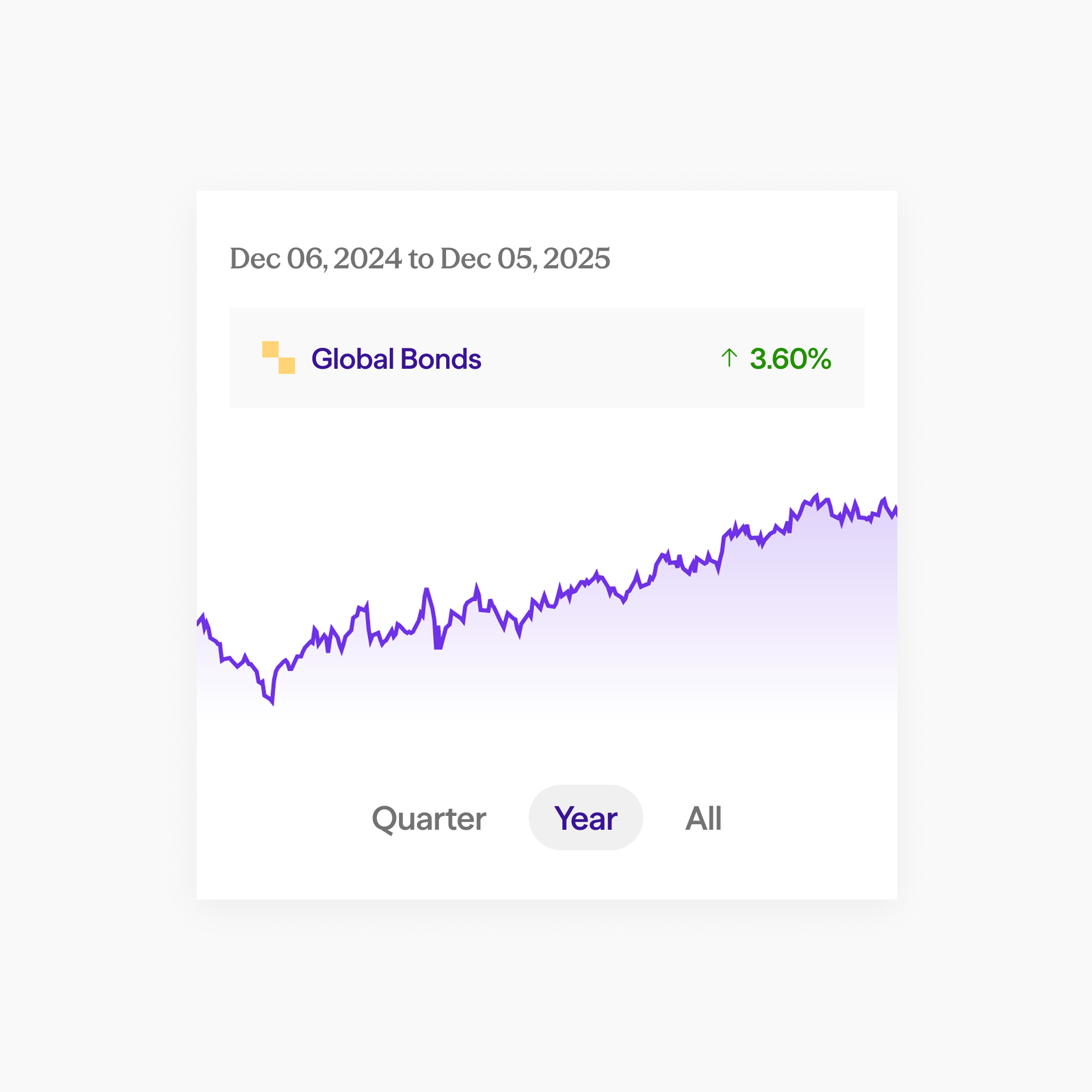 To summarise, for the Global Bonds portfolio, we charge 0.25% AuM-based fees per year. This is charged as a percentage of your investment amount, and is billed monthly.