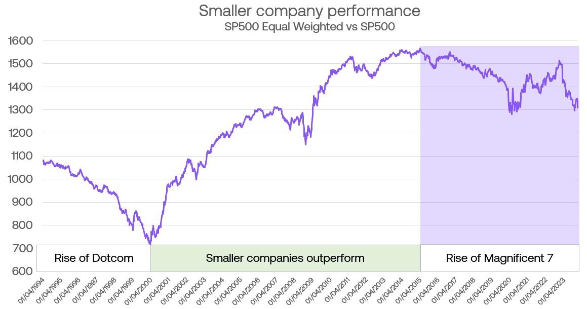 Is it time for smaller companies to shine again? History's shown us that smaller companies can totally steal the spotlight from the giants. Though the big names have been hogging all the glory since around 2015, let's not forget smaller companies did better for a 15 year stretch before the rise of the Magnificent 7. Can history repeat itself? We’re keeping our eyes peeled on the market.