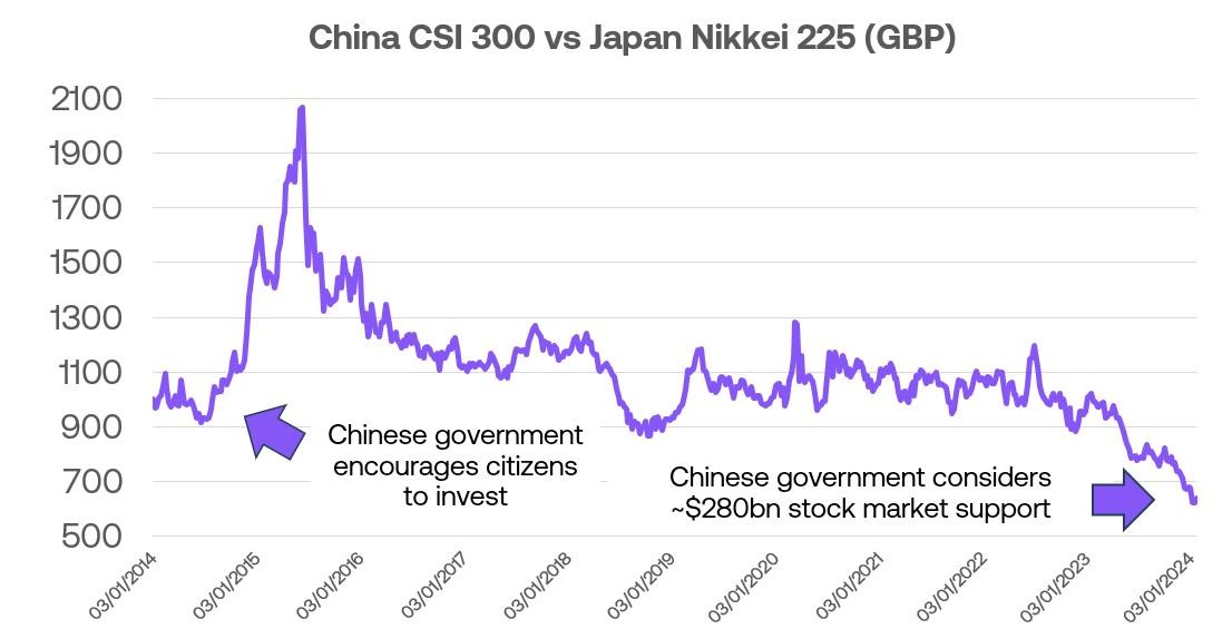Early 2024 saw some Asian hedge funds betting big on China stealing the spotlight from Japan, but instead, they ended up taking a major hit—so much so that some had to shut down [2]. But hold up, it's not all doom and gloom. There’s talks of a whopping $280 billion government rescue plan to get the Chinese stock market back on its feet[3]. It reminds us of a few years back, around 2014 and 2015, when the Chinese government encouraged folks to invest in domestic stocks, leading to a jaw-dropping surge of more than 150% in a year[4]. Maybe those hedge funds weren’t wrong, but just early. Time will tell.