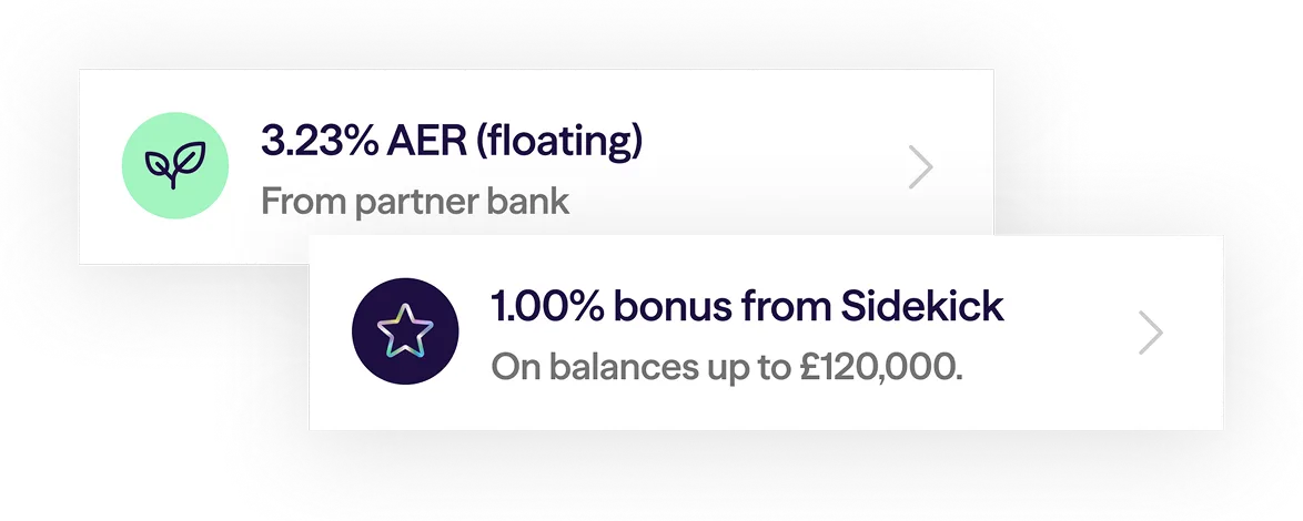 For 6 months, on balances up to £120,000, you'll earn an additional 1%, boosting the rate from 3.23% AER (variable) to 4.23% AER (variable). This bonus is paid by Sidekick within the first 2 working days of each calendar month into your Sidekick wallet. From here you can choose to add it into your Multi Shield account or withdraw it or to fund any other product we offer.