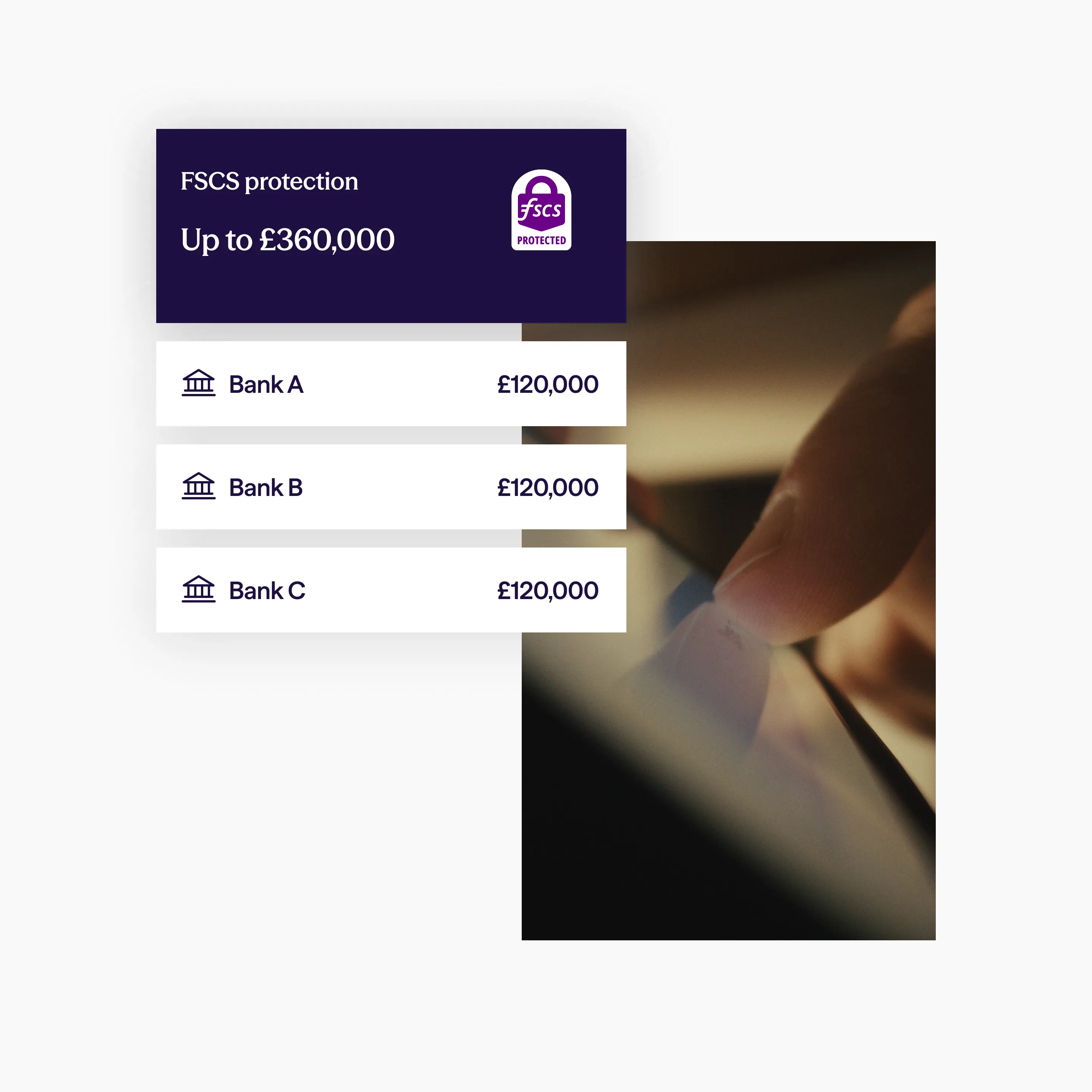 Each deposit you make is placed with one or more UK-regulated banks, each of which offers up to £120,000 in protection per person, per bank under the Financial Services Compensation Scheme (FSCS).